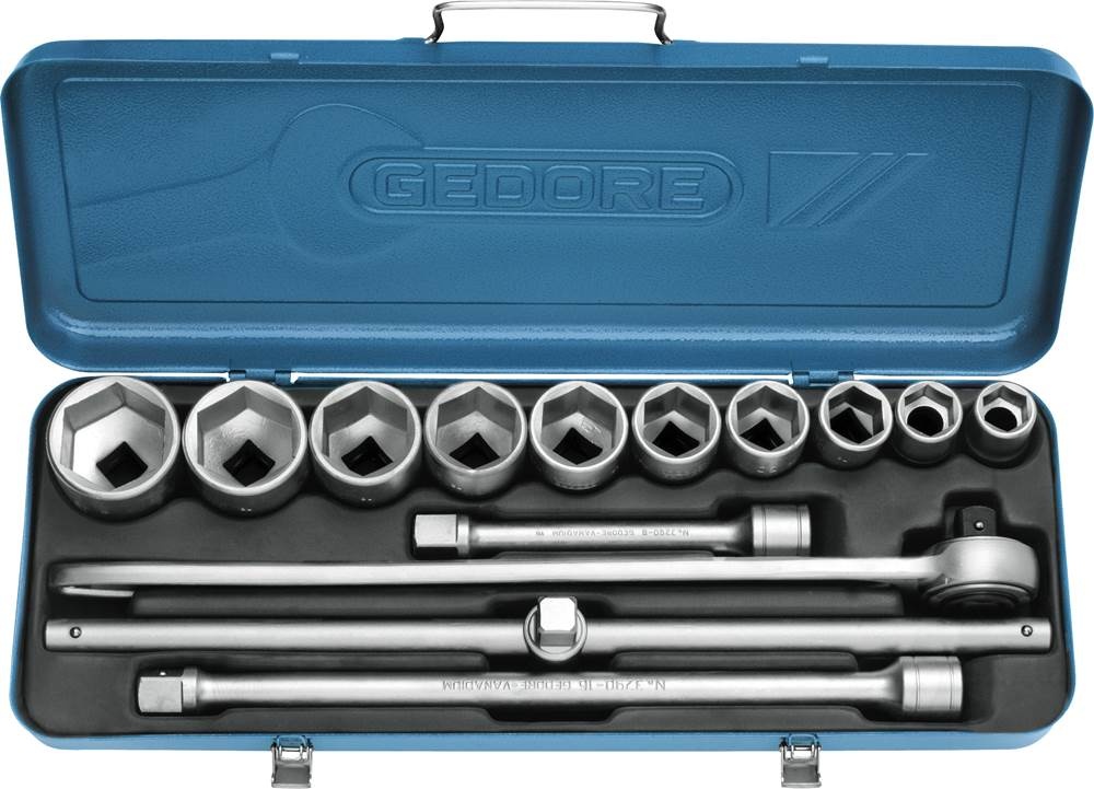 O jogo de soquetes e acessórios 3/4 são fabricados com aço gedore-vanadium e contém 14 peças. Para manter as ferramentas organizadas, possui estojo metálico, com acabamento em pintura eletrostática na cor azul e berço em polímero.